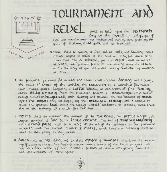 Announcement of the House of York Tournament and Revel in Madrone on July 16, 1972. From The Crier July 1972.