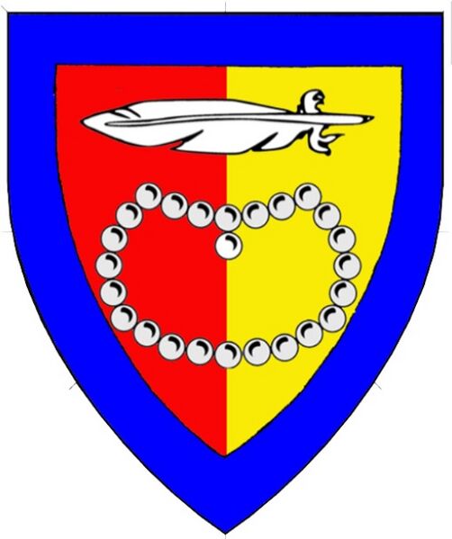 Per pale gules and Or, a necklace of pearls and in chief a feather fesswise argent, a bordure azure.