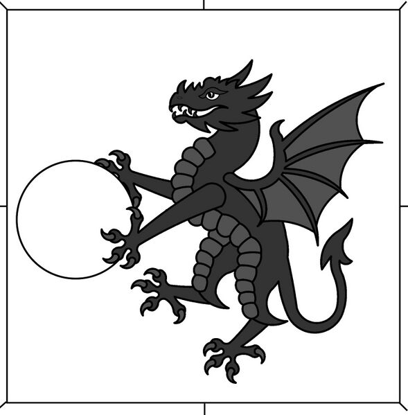 (Fieldless) A dragon rampant sable maintaining a plate (pearl)