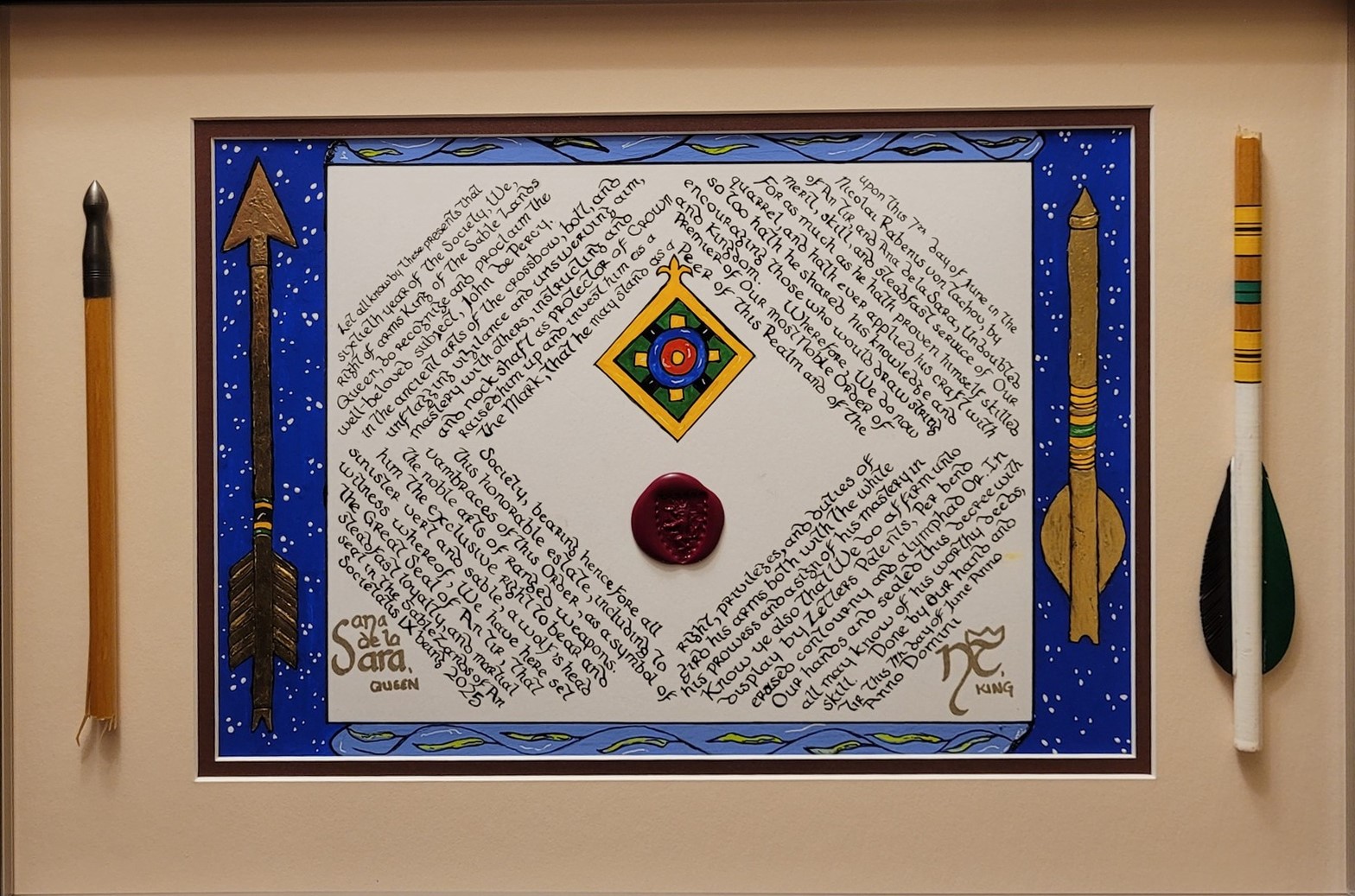 Order of the Mark scroll framed. The arrow was symbolically broken as part of the ceremony.