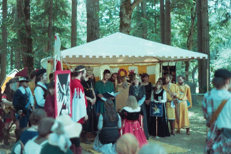 July Coronation, 10 July 1982. Manfred and Morag crown Torgul and Angharad. Photo courtesy of Theodulf of Borogrove.