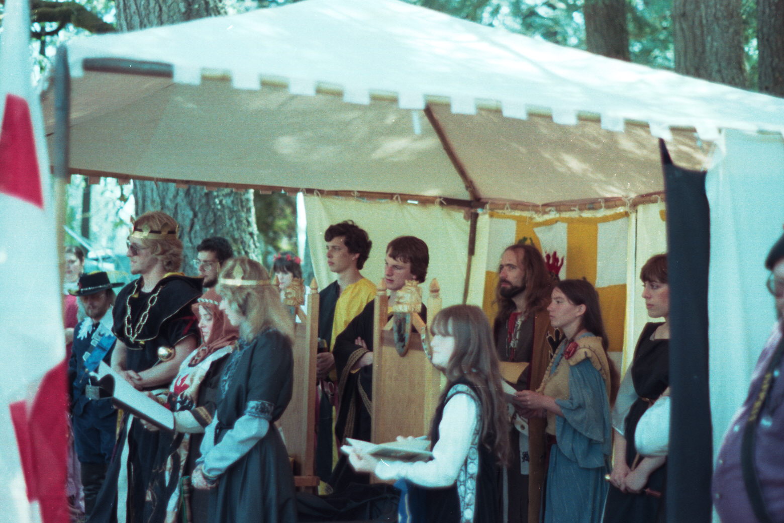 July Coronation, 10 July 1982. Manfred and Morag crown Torgul and Angharad. Photo courtesy of Theodulf of Borogrove.