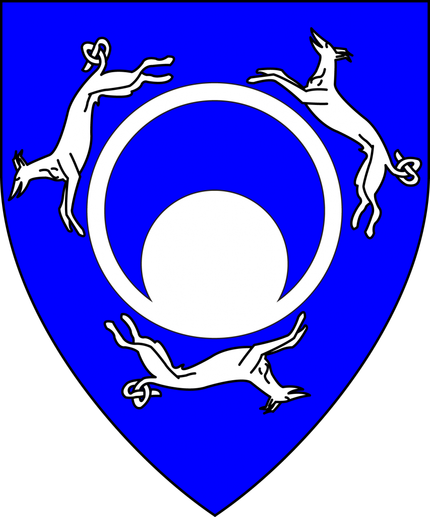 Heraldry of Maricka Sigrunsdotter. Azure, on a plate between three hounds courant in annulo tails nowed argent, a crescent pendant azure.