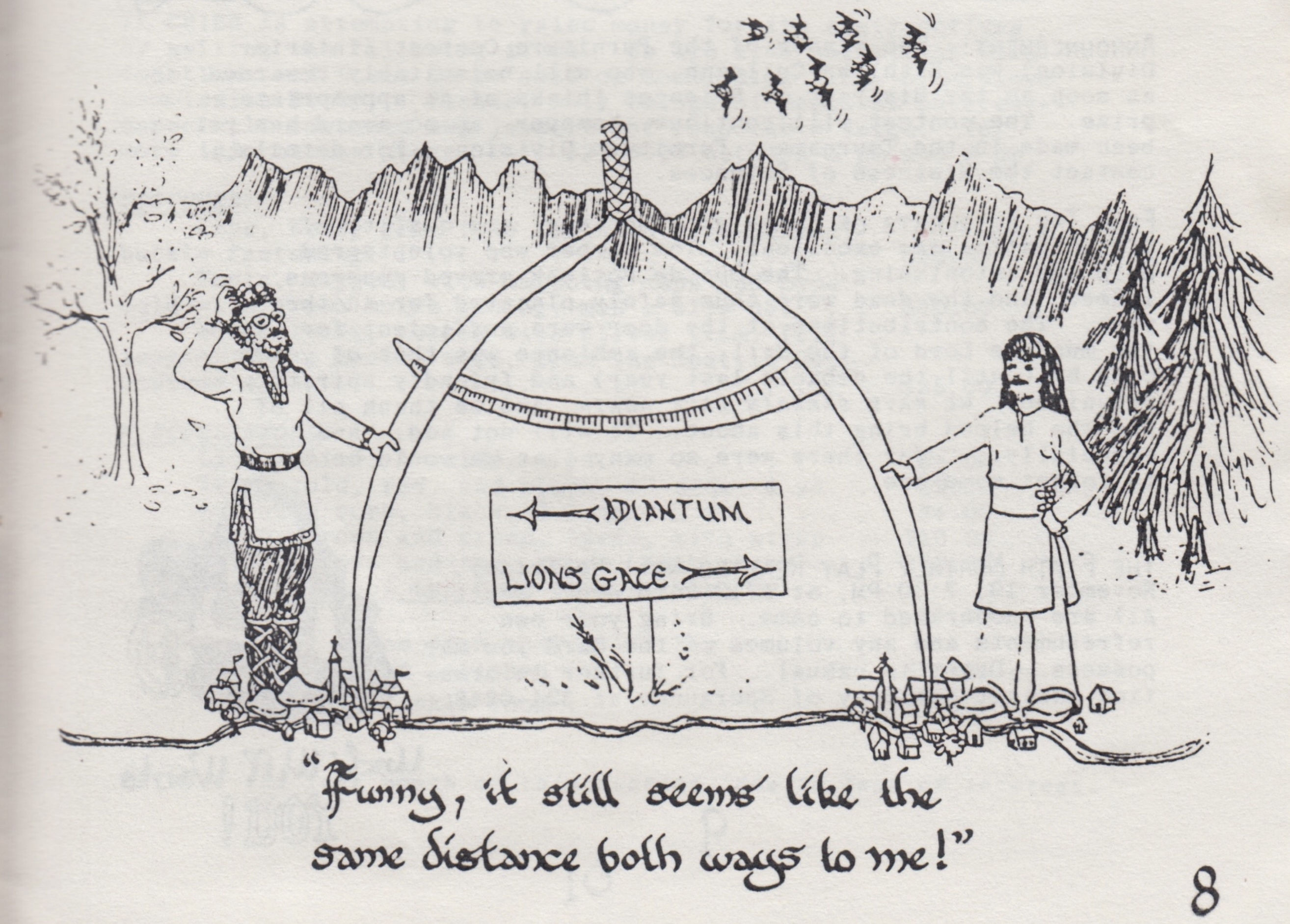 Illustrated commentary on inclusion of Lionsgate and Adiantum expanding central An Tir from the previous Three Mountains to Madrone corridor. The Crier, December 1976, page 8. Artist likely Serena of Bagulay.