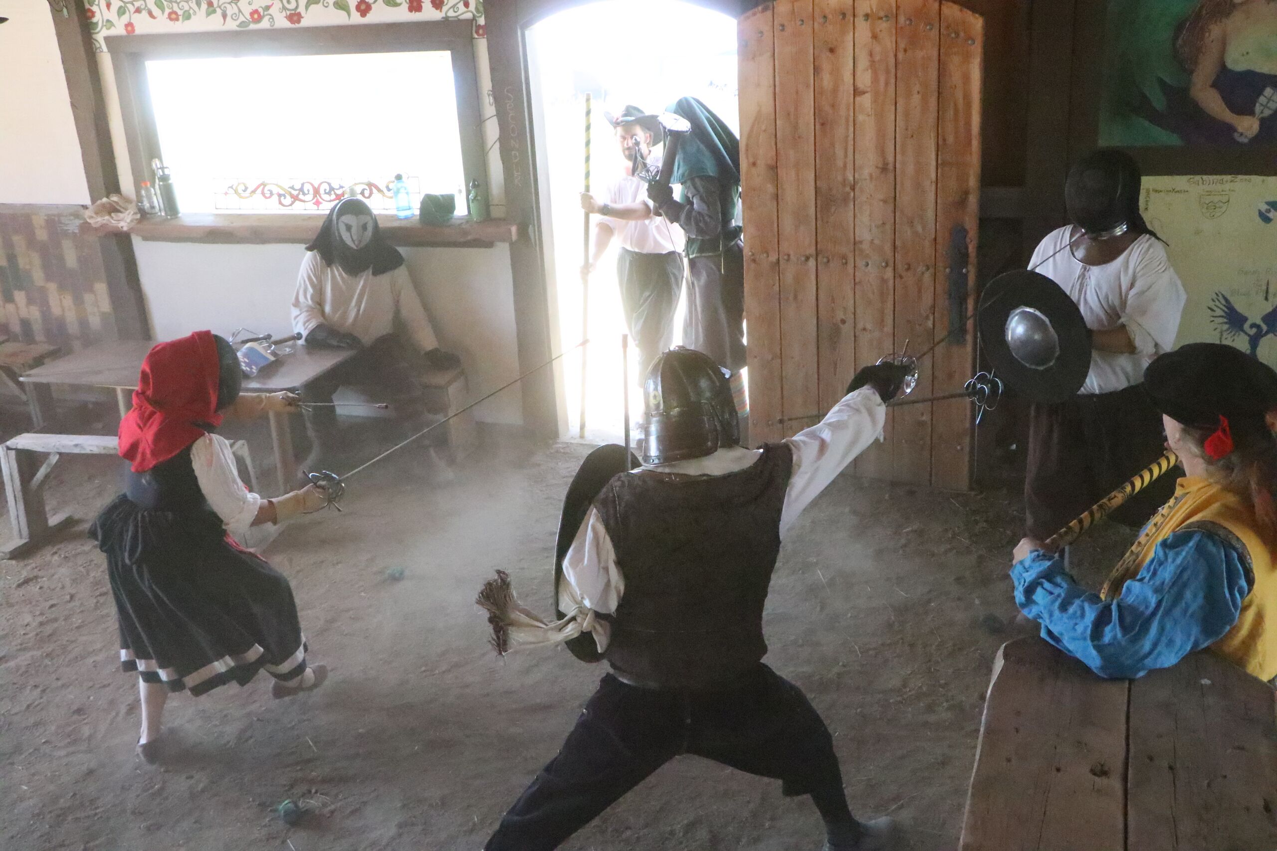 Fighting within the tavern at Lions War towards the end of the scenario. Fighters are Madelena Vieri (red back of head), Warrick Drakkar (silver helm) and Draven Mac Raith (black back of head), sitting is Seamus McKinneach, in the doorway is Steffan Drakkar with the marshal staff, Matteo de Malizia exiting while holding a portion of the prop stools used in fighting scenarios, and Malie Rennick leaning against the bar with the marshal staff.