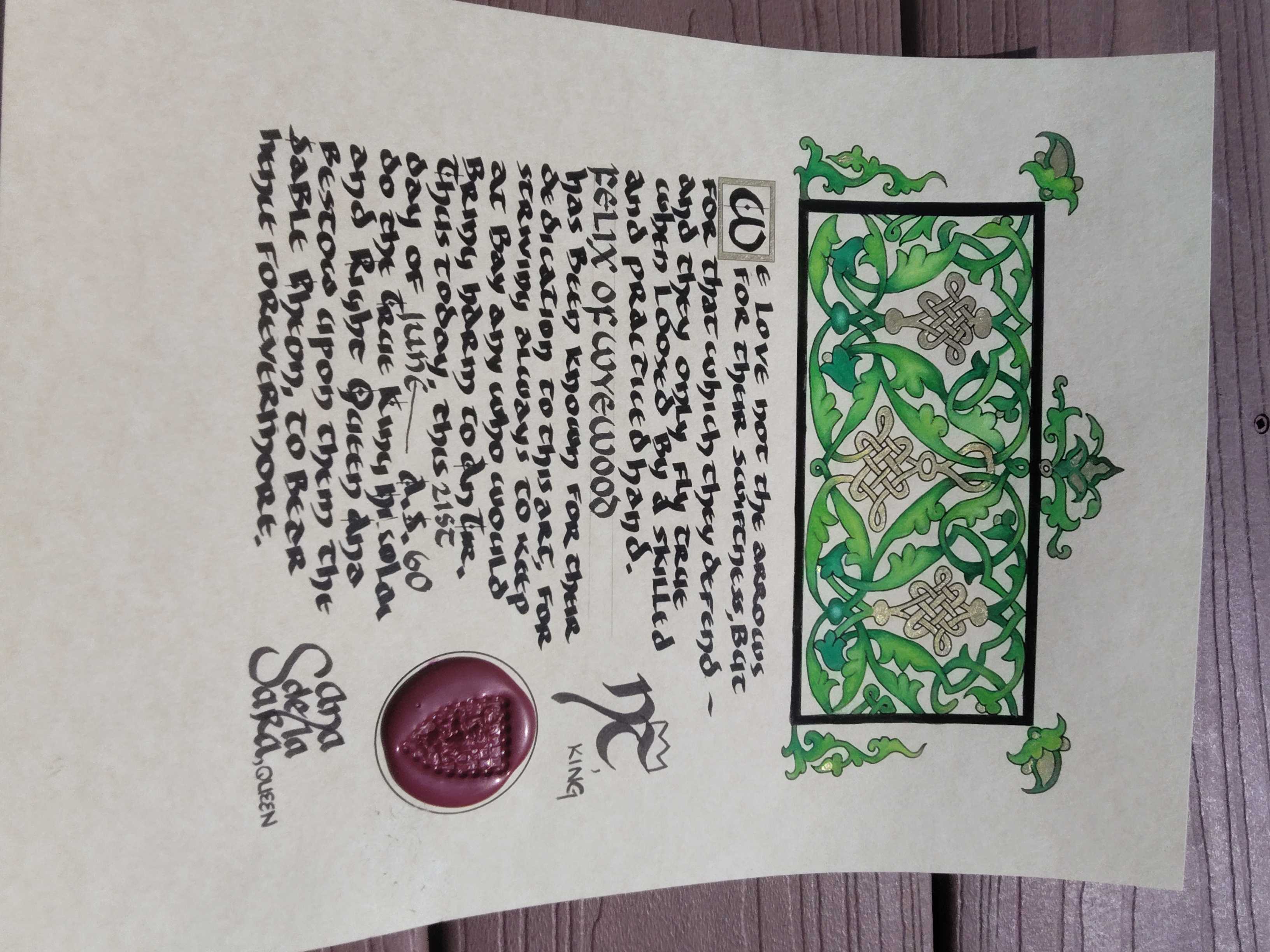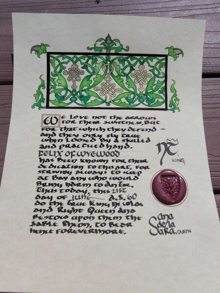 | current | 15:58, 2 September 2025 | 2,448 × 3,264 (497 KB) | Michelino di Gino Martini (talk | contribs) | Sable Pheon scroll - Felix of Wyewood. Photo by Felix of Wyewood. |