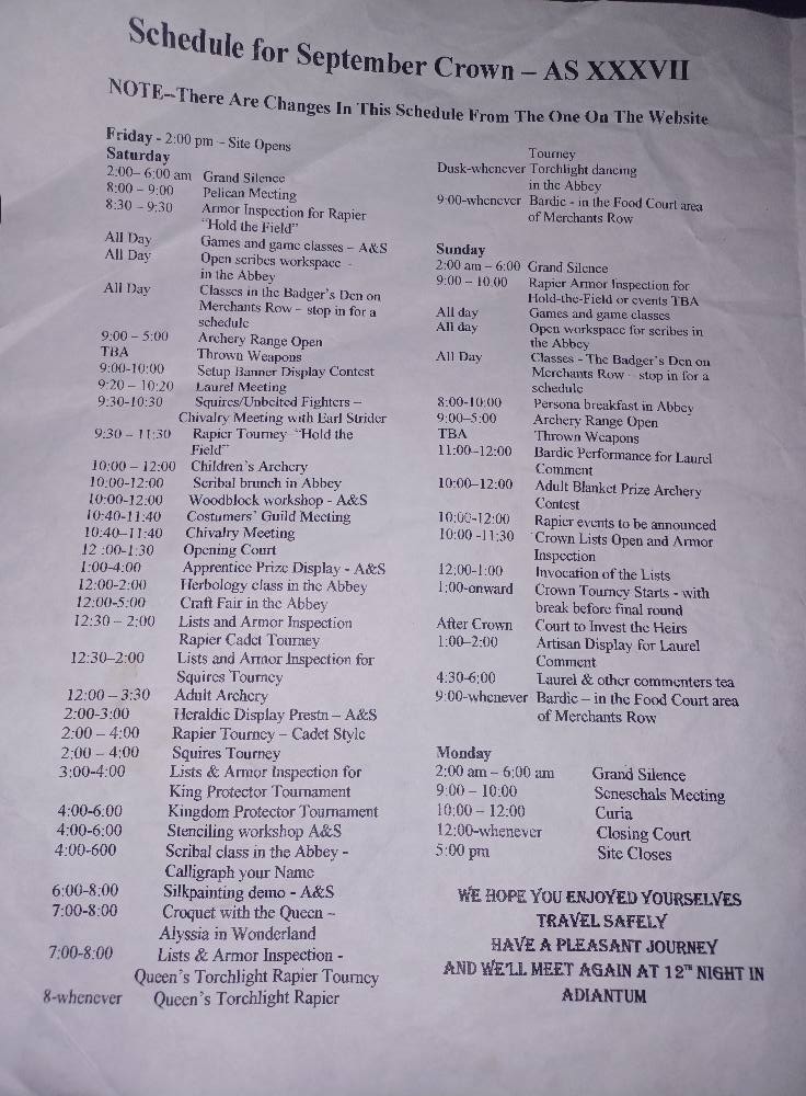 Site schedule from September Crown 2002, photo by J.d. Johann Shush