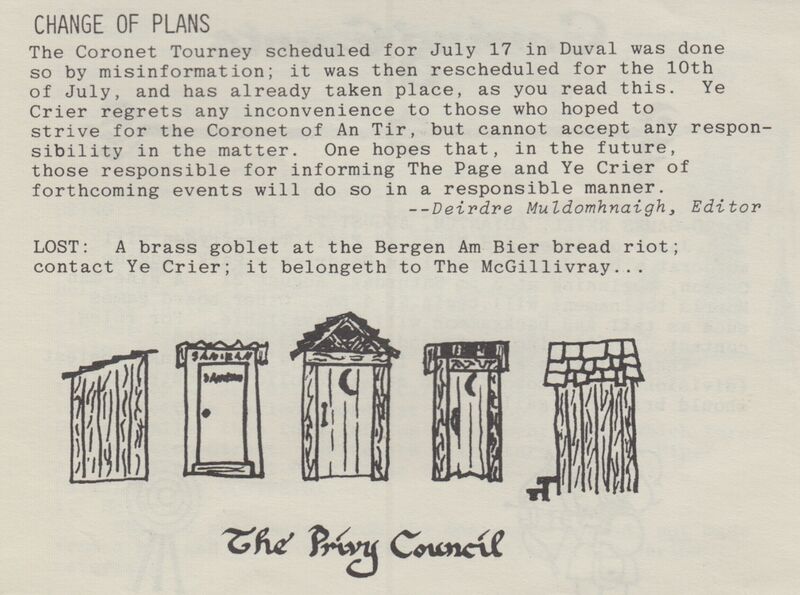 Comment concerning the unexpected change of the principality Coronet Tourney scheduled for July 17th to July 10th 1976 from the Editor of The Crier, August 1976, page 2.
