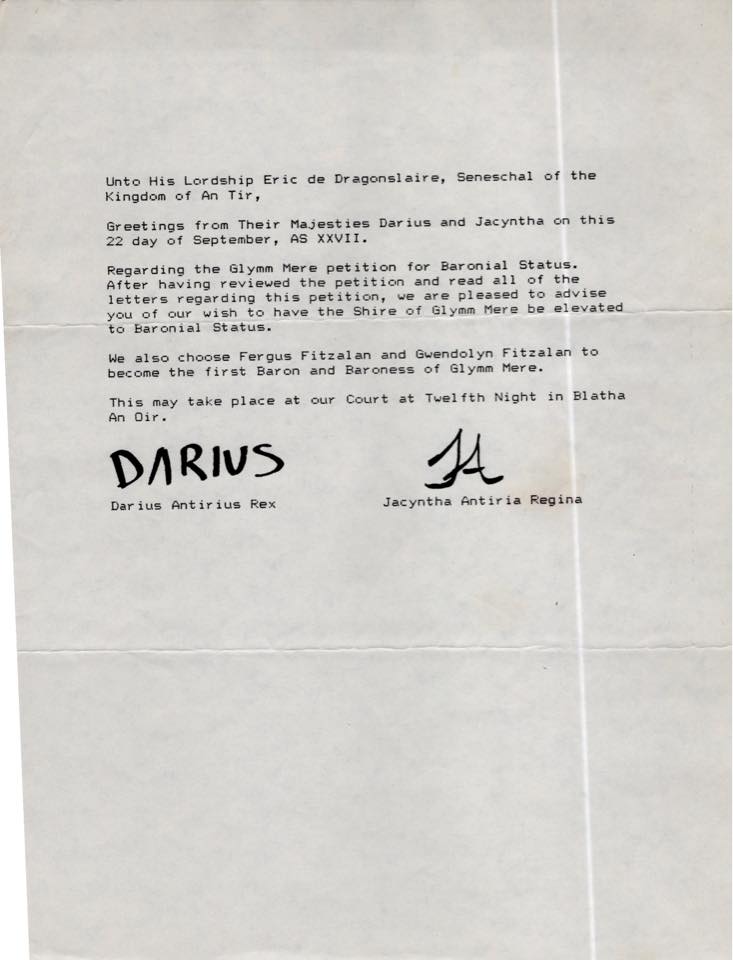 Their royal majesties of An Tir accept the elevation of Glymm Mere to a barony.