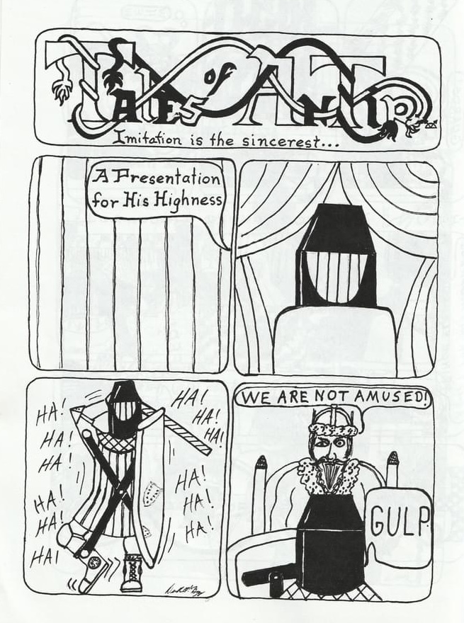 Comic page featuring the story from Twelfth Night 1977 when “Interspaced among gluttony, reveling, and flirtation were a Walking Talking Zifran Doll who staggered from the hall, flailing away.” From Tales of An Tir by Dublin Briggs (Sir Dublin O’Guinn).