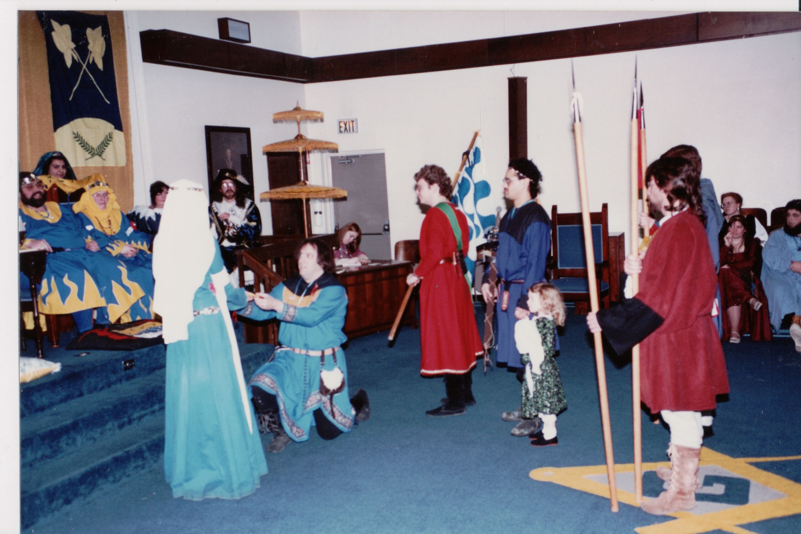 At Glymm Mere’s first baronial court, the Beevairian Company, represented by its Captain Valerian the Innocent, presented a gift to their long serving “Queen Bee” Mistress Tess Ella of Silvershadow.