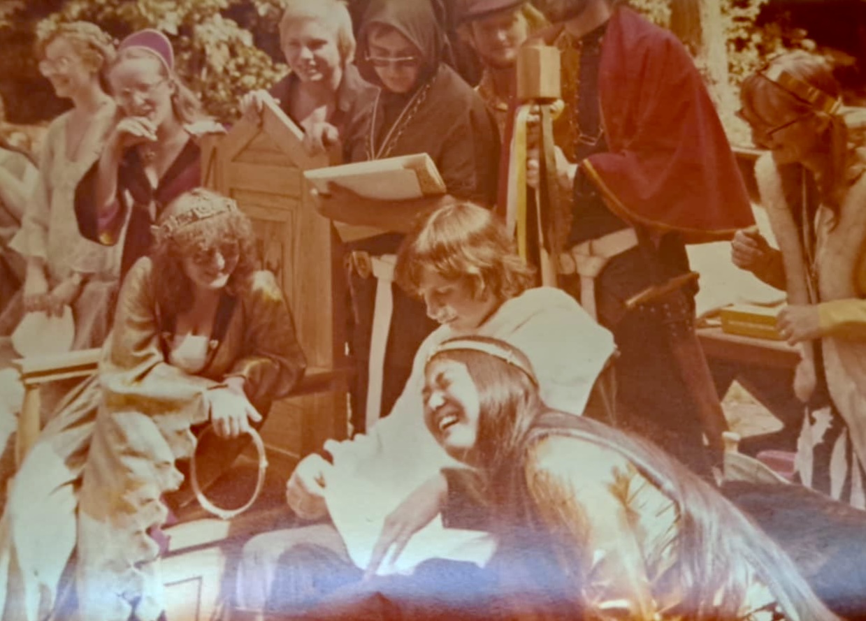 Trelon recovering from pie (banana cream) in the face, at An Tir Coronation and Champion Tourney in Lion’s Gate, 21 July 1979. Sir Morgan behind thrones. Tamsin laughing seated on the right with Baroness Amanda Kendal behind her. Photo courtesy of Duke Trelon.