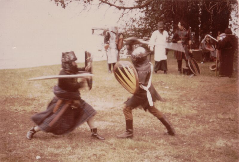 Newly made Master Raymond the Mild, Founding Baron of Madrone, fighting with Sir Frederic of the West Tower, Founding Baron of Three Mountains, at the Royal Tourney of Union, 1973 in Madrone. Photo courtesy of Theodulf of Borogrove.