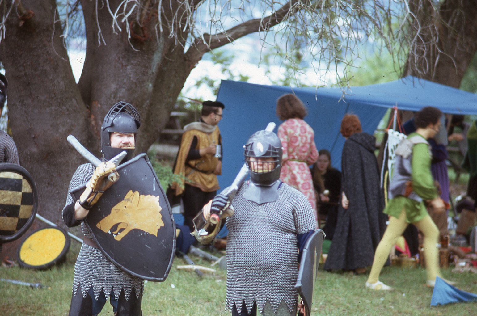 John of Ravenwolf and Richard of Ravenwolf at the Royal Tourney of Union, 1973 in Madrone. Photo courtesy of Theodulf of Borogrove.