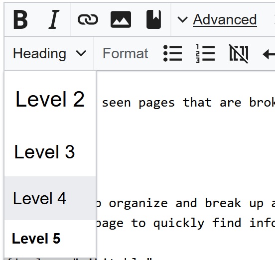 Example of the formatting toolbar in the wiki showing section headings.