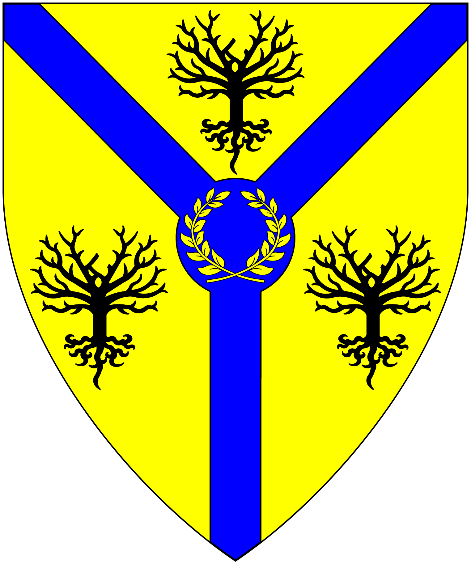 Or, on a pall nowy azure between three trees blasted and eradicated sable a laurel wreath Or.