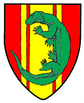 Gules, a pale cotised Or, overall a Komodo dragon embowed in pale vert. |