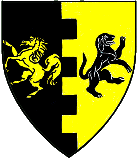 ![]() Per pale embattled sable and Or, a horse and a talbot rampant addorsed counterchanged. |