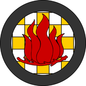 Checky Or and argent, a flame maintaining in base a branch fesswise gules, a bordure sable. | |||||||||