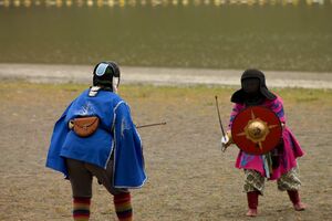 Photo by Andrew Williams at Barony of Wastekeep Sergeant Trials 2018. Melike bint Mihail rapier fighting with Michael of Lancaster using her newly made Ottoman style buckler and saber style rapier