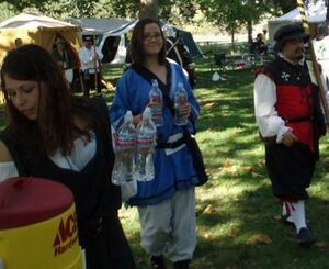 Photo by Sadhbh Dhubh at Barony of Wastekeep Baron's Ball 2010. Melike assisting with one of her favorite tasks at the time, water bearing for the fighters.