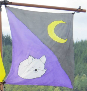 Silk banner painted by Melike with personal device: Per bend sable and purpure, a decrescent Or and a fox dormant argent.
