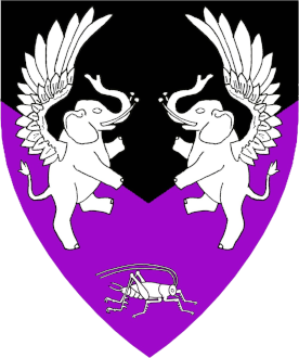 ![]() Per chevron inverted sable and purpure, two winged elephants combatant and in base a cricket statant contourny argent. |