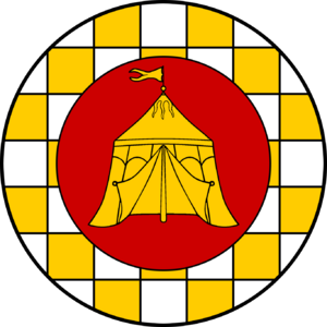 The badge of the order: Checky Or and argent, on a roundel gules a pavilion Or.
