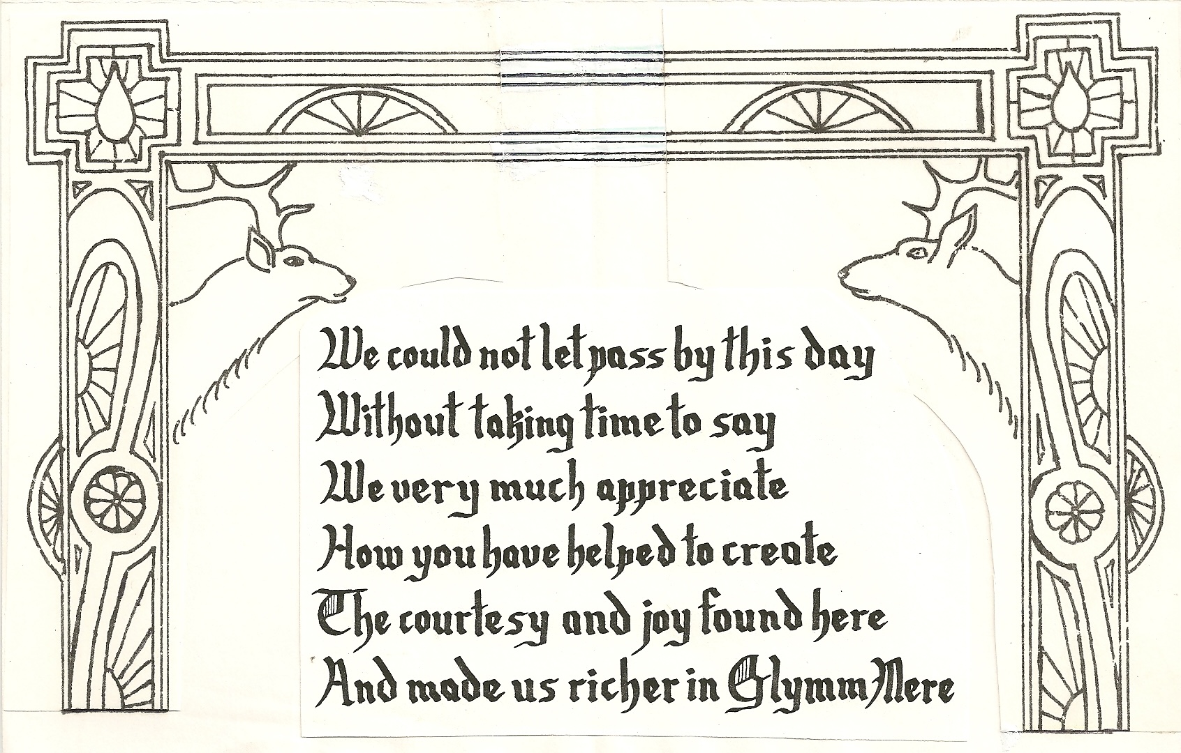 | 15:18, 25 November 2025 | GMThankYou1993B.jpg (file) | 663 KB | SirRichard | Thank you card from Baron Richard and Baroness Gwendolyn Fitzalan as Baron and Baroness of Glymm Mere from 1993-1995. Interior frame of Crystal raindrops and Red Deer honor the Shire and Barony’s awards of the Crystal and the Red Deer (now Red Hart). Art by HL Vaclav Bili. Thank you poem written and calligraphed by Baron Richard Fitzalan. | 1 | |