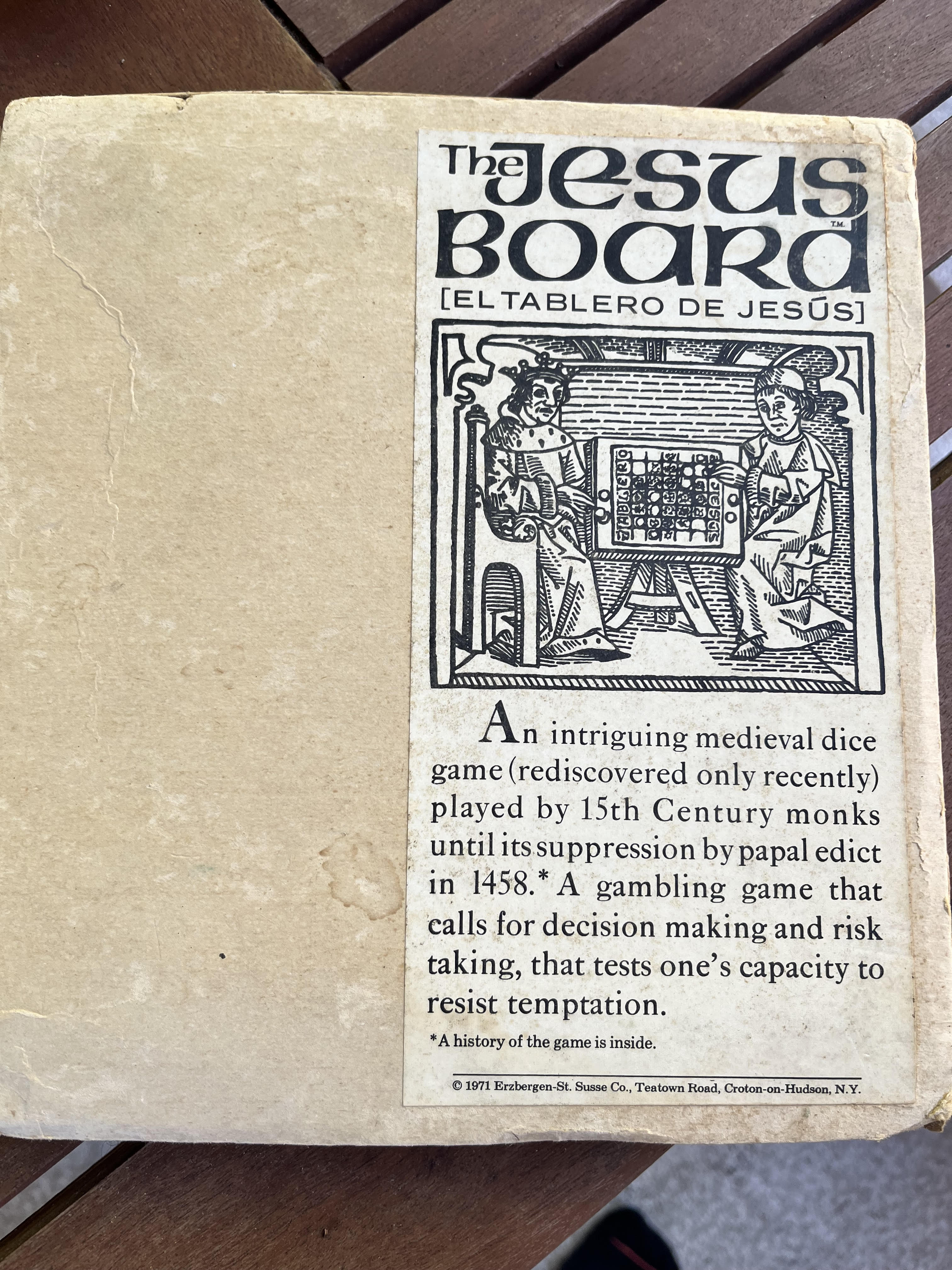 | 07:26, 24 November 2025 | Tablero de Jesus 1971 description.jpg (file) | 1.3 MB | Michelino di Gino Martini | Description of El Tablero de Jésus game from 1971 box. | 1 | |