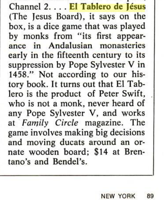 | 07:18, 24 November 2025 | NewYorkDec20-1971.png (file) | 634 KB | Michelino di Gino Martini | Section of "Best Bits" column in the New York Magazine that mentions Tablero de Jesus. Small section reproduced under fair use. | 1 | |
