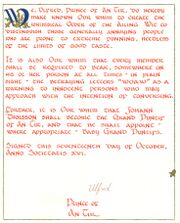 | 15:45, 7 January 2009 | Arawn Recommendation.JPG (file) | 1.06 MB | Be it known to all that the bearer of this letter Arawn MacPhaelan has served the Barony of Wastekeep with honor. May he bring his strength, widom and joy to all lands his journeys take him. He carries our highest recommendation. Styrkarr & Stjarna Ba | 1 | |