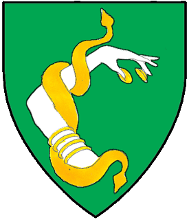 ![]() Vert, an arm embowed with hand to sinister argent, holding zils, with four armbands and entwined by a double-headed serpent, all Or. |