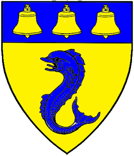 Or, a dolphin haurient and on a chief azure three bells Or.