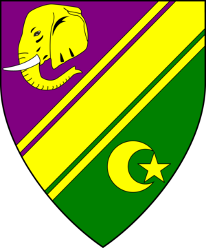 Per bend sinister purpure and vert, a bend sinister cotised between an elephant's head couped close and a decrescent with a mullet suspended between its horns Or. |